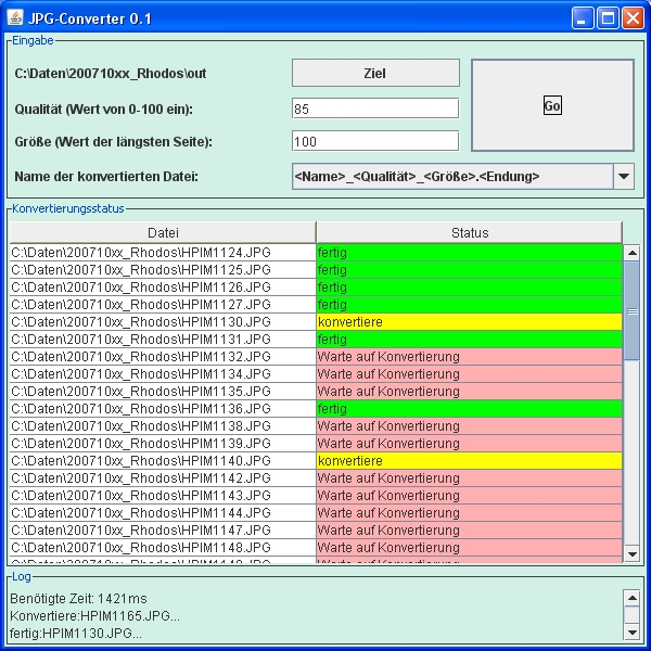 Java benötigt beim Aufruf die Information wieviel Speicher insgesamt verwendet werden darf. Wenn mehrere Dateien gleichzeitig konvertiert werden und diese auch noch hochaufgelöst sind, wird unter Umständen die Standard Größe von 64 MB überschritten. Der einzelne Prozess bleibt dann hängen, die Anwendung selbst scheint aber weiter zu funktionieren. Ruft man die beiliegende Batch-Datei jpg-converter.cmd auf, sollte das Problem nicht mehr bestehen. Dort werden 128 MB Minimum und 1024MB Maximum vorgesehen.